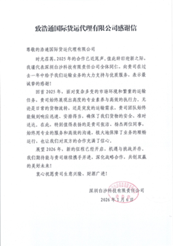 攜手同行,共創雙贏 | 浩通國際獲深圳白沙科技誠摯感謝信